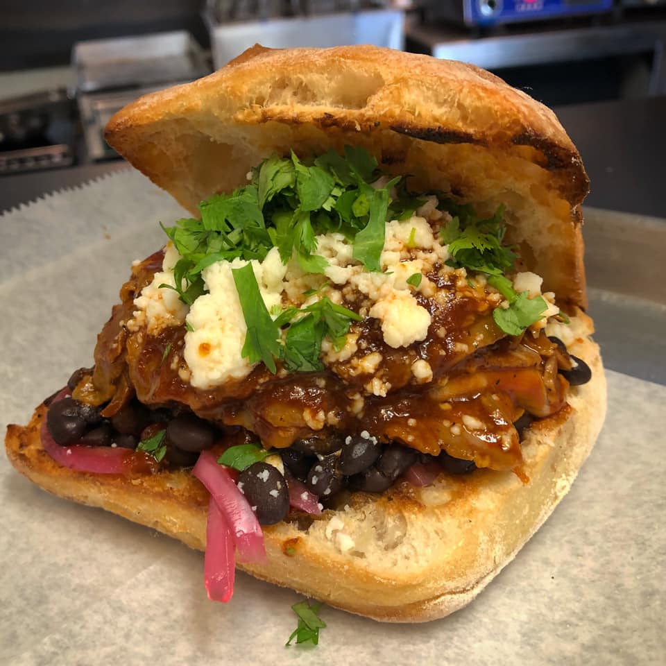 Del Rey Deli Co.: You know what, I would not call L.A. a sandwich town. Which is fine, it makes each good one a gem. Del Rey's are better than average, sometimes to a high degree. For example, here is its veggie sandwich: roasted mushrooms, avocado, roasted beets, toasted pepitas, pickled red onion, arugula, Persian cucumbers, and buttermilk-chive dressing on ciabatta.